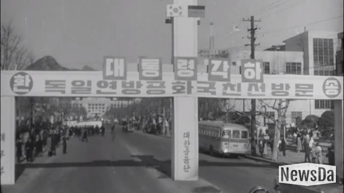 박정희 대통령, 독일 방문에 오름.-태극기 게양, 경축 현수막.-공항으로 향하는 박정희 대통령, 연도의 시민들 환송.-박정희 대통령 공항 도착, 국민의례, 예포 발사, 사열