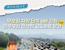 뉴스다 최광묵 기자 | 무보험 차량 단속 6배 강화 의무보험 전산망 고도화로 운영(11.28.~) 무보험·뺑소니 피해자 정부보장사업 부담도 개선 되겠네~ 도로 이용정보·단속정보가 연계되어 단속 범위가 확대 되겠어~ [뉴스출처 : 국토교통부]