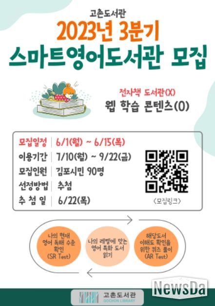 뉴스다 최광묵 기자 | 김포시 고촌도서관은 7월 10일부터 9월 22일까지 “2023년 3분기 스마트영어도서관”을 운영한다.