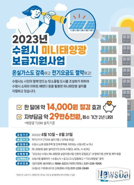 뉴스다 최광묵 기자 | 수원시는 ‘2023년 미니태양광 보급지원사업’에 참여할 시민을 11월 30일까지 선착순으로 모집한다.