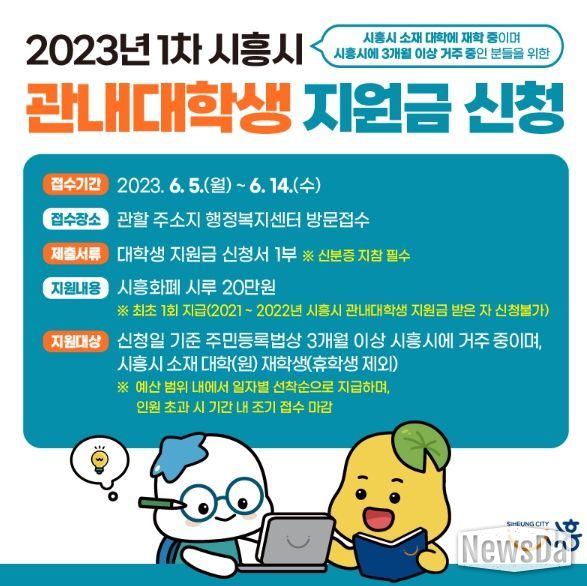 뉴스다 최광묵 기자 | 시흥시는 오는 6월 5일부터 14일까지 2023년 1차 시흥시 관내 대학생 지원금을 신청받는다.
