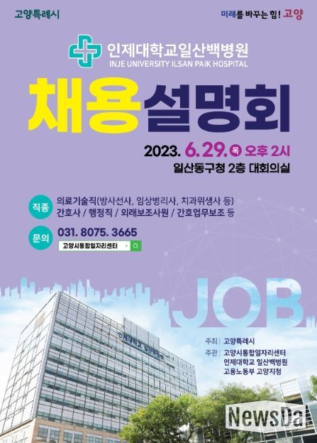 뉴스다 최광묵 기자 | 고양시는 관내 대형의료기관의 구인난 해소 및 구직자 취업 지원을 위해 ‘고양시 의료기관 일자리 릴레이 채용설명회’의 2탄을 6월 29일 일산동구청 대회의실에서 대면 및 비대면 방식으로 개최한다.