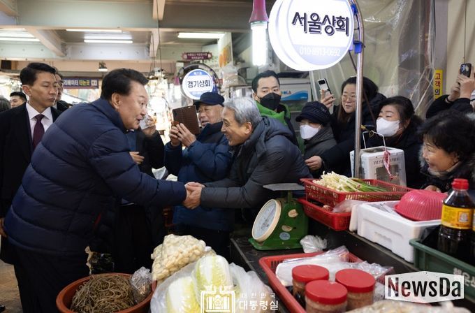 뉴스다 최광묵 기자 | 윤석열 대통령은 1월 25일 경기도의 대표 전통시장인 의정부제일시장을 찾아 최근 불경기에 동절기 한파까지 겹쳐 어려움을 겪고 있는 상인들을 격려하고 현장의 이야기를 경청했다.