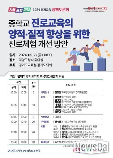 뉴스다 최광묵 기자 | 경기도교육청이 27일 ‘중학교 진로교육의 양적․질적 향상을 위한 진로체험 개선 방안’을 주제로 경기교육 정책토론회를 개최한다.