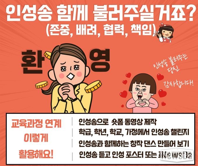학교에서는 1교 1인성 브랜드, 교육과정과 연계해 ▲인성송으로 여는 수업 ▲학교와 가정을 연계한 인성송 챌린지 ▲학생자치회 주관 인성송 행사 등 자율적으로 활용할 수 있다.