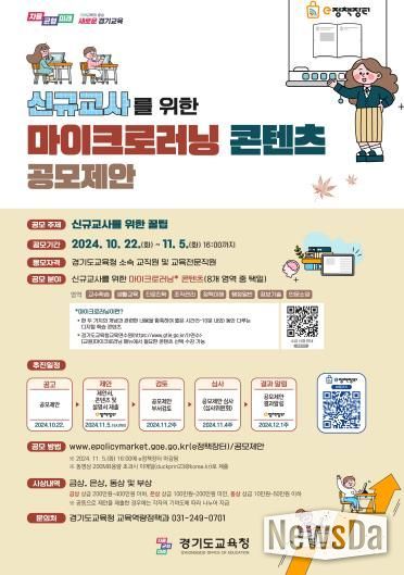 뉴스다 최광묵 기자 | 경기도교육청이 ‘신규교사를 위한 꿀팁’을 주제로 단기학습 교육자료(마이크로러닝 콘텐츠)를 공모한다. 단기학습 교육자료 제작 배포로 신규(저경력)교사의 교직 적응력을 높이고 교원 전문성을 지원하기 위한 목적에서다.
