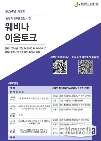 뉴스다 최광묵 기자 | 경기도교육연구원 오는 24일 오후 2시 ‘현장’과 ‘연구’를 잇는 2024년 제2회 웨비나 이음토크를 개최한다.