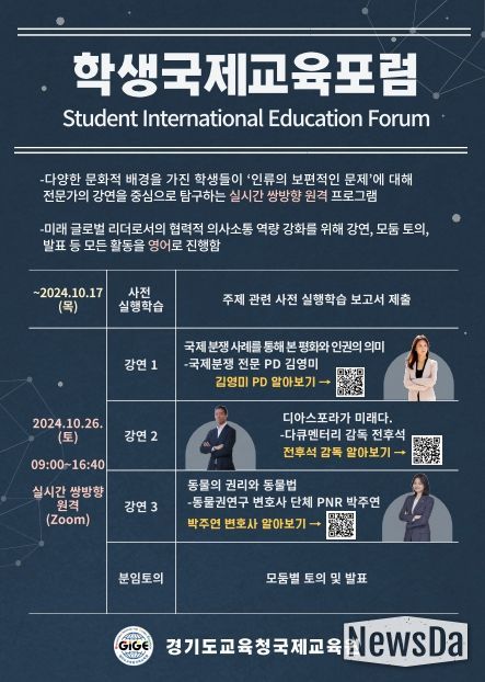 뉴스다 최광묵 기자 | 경기도교육청국제교육원이 26일 도내 고등학생과 해외 학생, 학교 밖 청소년을 대상으로‘학생 국제교육 포럼’을 개최했다.