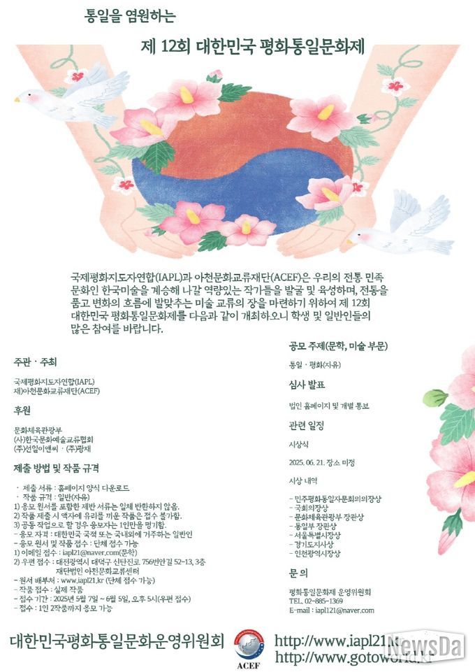 뉴스다 최광묵 기자 | 국제평화지도자연합(IAPL)과 재)아천문화교류재단(ACEF)이 공동 주최하는 행사로 대한민국 평화통일문화제는 문학 및 미술 대회가 공모전으로 열리며, 시상식에서는 특별공연이 펼쳐지며, 유치부, 학생부 및 일반 누구나 참여할 수 있으며, 5월 7일부터 6월 5 까지 접수하여 6월 21일에 시상하는 통일을 염원하는 제12회 대한민국 평화통일문화제를 개최한다고 밝혔다.