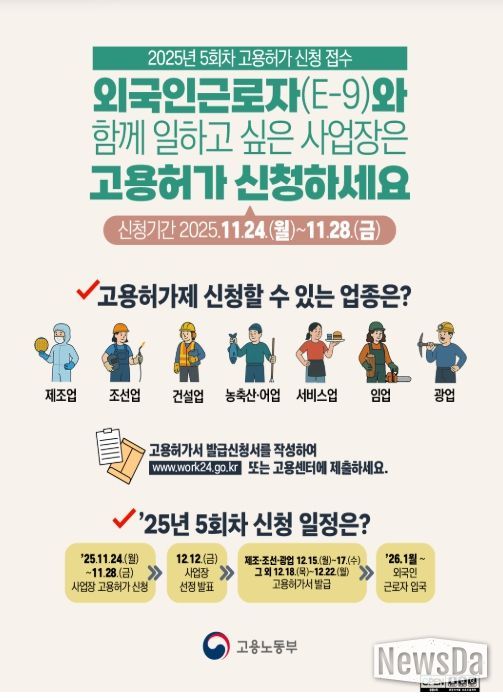 뉴스다 최광묵 기자 | 고용노동부는 11월 24일부터 11월 28일까지 전국 지방고용노동관서를 통해 외국인근로자(E-9)에 대한 올해 5회차 신규 고용허가 신청을 받는다.
