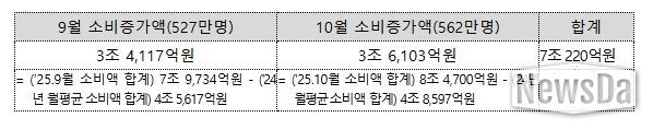 한편, 9·10월 환급(페이백) 지급 대상자(중복 포함, 1,089만명)가 작년 월평균 카드 소비액보다 총 7조 220억원을 더 지출한 것으로 확인됐다. 이는 지급액(6,430억원)의 11배에 달하는 규모다.