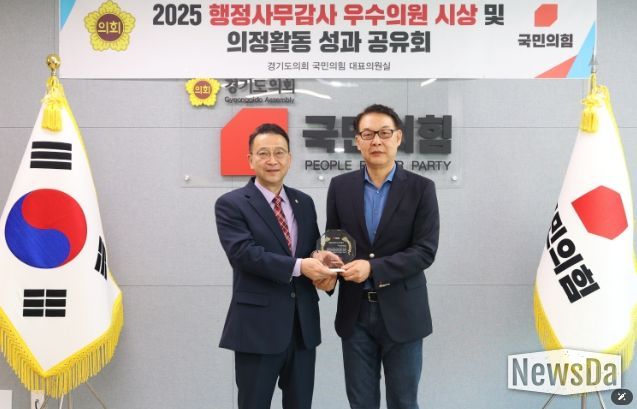 뉴스다 최광묵 기자 | 경기도의회 안전행정위원회 강웅철 의원(국민의힘, 용인8)이 2025년 행정사무감사에서 날카로운 지적과 정책 제언을 통해 경기도정 발전에 기여한 공로를 인정받아 '행정사무감사 국민의힘 우수 선정 의원'으로 수상하는 영예를 안았다.