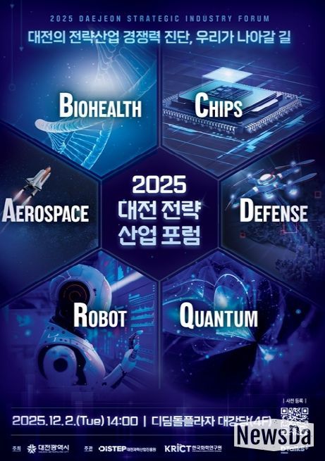 뉴스다 최광묵 기자 | 대전시는 대전과학산업진흥원(DISTEP), 한국화학연구원(KRICT)과 함께 오는 12월 2일 오후 2시, 한국화학연구원 디딤돌플라자 4층 대강당에서 ‘2025년 대전 전략산업 통합포럼’을 개최한다.