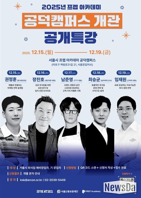 한편, 서울시는 공덕캠퍼스 개관을 맞아 12월 15일부터 19일까지 ‘프렙 아카데미 공개 특강’을 개최한다. 이번 특강은 ▲상권 분석 ▲손익 구조 이해 ▲마케팅 전략 등 외식 창업에 필요한 실무 중심 강좌로 구성되며, 외식업계 전문가 명사 특강도 함께 진행된다. 특강은 기존 수료생뿐만 아니라, 외식 창업에 관심 있는 예비·기 창업자 누구나 참여할 수 있으며, 교육비는 전액 무료이다. 신청은 12월 8일까지 서울시 소상공인종합지원포털을 통해 선착순 접수받는다.