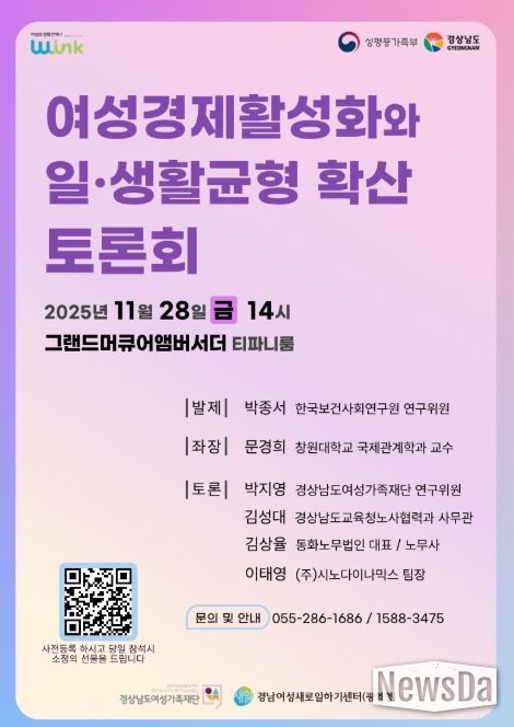 뉴스다 최광묵 기자 | 경상남도는 28일 오후 2시 창원 그랜드머큐어앰배서더 티파니룸에서 ‘여성 경제 활성화와 일·생활균형 확산 토론회’를 개최한다고 밝혔다.