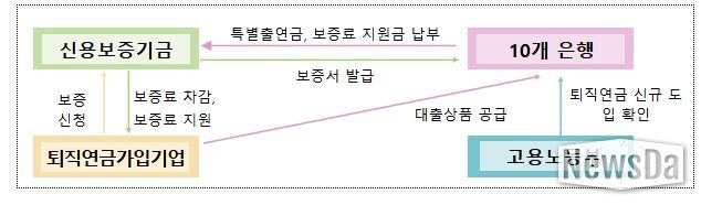 고용노동부 주관으로 민·관·공이 협력하여 실시하는 이번 사업을 통해, 10개 은행은 총 132억원을 신용보증기금에 출연했다. 그리고 신용보증기금에서는 이를 재원으로 퇴직연금제도를 신규 도입한 중소기업이 경영자금을 대출받을 수 있도록 대출금액에 대하여 기업당 최대 5억원, 총량 약 3,300억원 규모의 ‘특별출연 협약보증’ 및 ‘보증료 지원 협약보증’을 지원할 예정이다. 중소기업은 협약보증을 토대로 10개 은행에서 경영자금을 대출받을 수 있다.