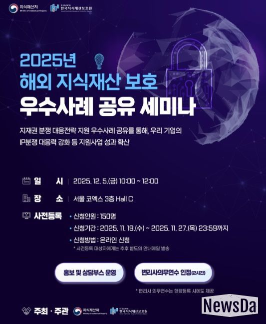 뉴스다 최광묵 기자 | 지식재산처는 12월 5일 10시 코엑스(서울시 강남구)에서 ‘2025년 해외 지식재산 보호 우수사례 공유 세미나’를 개최한다. 이번 행사는 2025 대한민국 지식재산대전의 일부 행사로 진행되며, 우리 기업이 해외 시장에서 자주 마주하는 지식재산 분쟁에 효과적으로 대응할 수 있게 실제 우수 사례와 대응 전략을 공유하는 자리로 마련됐다.