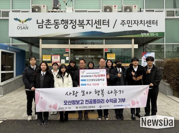 뉴스다 최광묵 기자 | 오산시 남촌동행정복지센터는 지난 16일 오산정보고등학교 전공동아리 학생들과 주훈지 교장, 담당교사 등이 참석한 가운데 관내 저소득층 지원을 위한 바자회 판매 수익금 70만 원을 기탁받았다고 밝혔다.