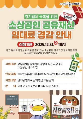 대덕구는 영업 활동에 직접 사용하는 공유재산을 대부받은 소상공인과 중소기업을 대상으로 2025년 1월부터 12월까지 부과되는 임대료의 60%를 감면한다고 밝혔다.