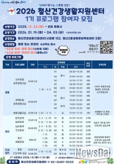 센터는 이 성과를 바탕으로 오는 22일부터 선착순으로 ‘2026년 건강생활 프로그램’ 참가자를 모집한다. 신청은 모집 마감 시까지 방문 또는 광명이(e)지 누리집에서 가능하다.