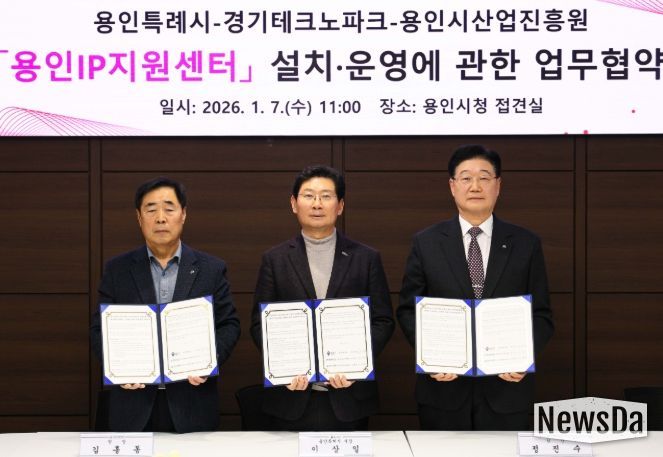 뉴스다 최광묵 기자 | 용인특례시는 7일 시청 접견실에서 경기테크노파크, 용인시산업진흥원과 '용인IP지원센터 운영에 관한 상호협력 협약'을 체결했다.