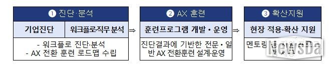 ③ 3단계(확산지원): 훈련 종료 후에도 현장 적용 시 발생하는 문제를 해결할 수 있도록 전문가의 ‘밀착형 코칭’을 지원하고, 우수사례 공유회를 개최해 인공지능 전환(AX) 성과를 확산시킨다.