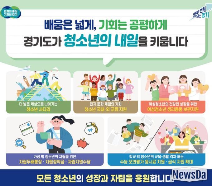 뉴스다 최광묵 기자 | 경기도가 청소년의 건강한 성장과 배움 기회, 생활 안정을 위해 급식, 학습·진로·자립 지원까지 아우르는 다양한 정책을 추진한다.