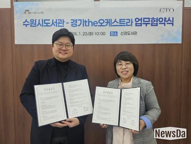 뉴스다 최광묵 기자 | 수원시도서관은 경기더(the)오케스트라는 20일 수원시 도서관사업소에서 업무협약을 체결하고, 공공도서관을 중심으로 한 시민 참여형 문화예술 프로그램 운영에 협력하기로 했다.