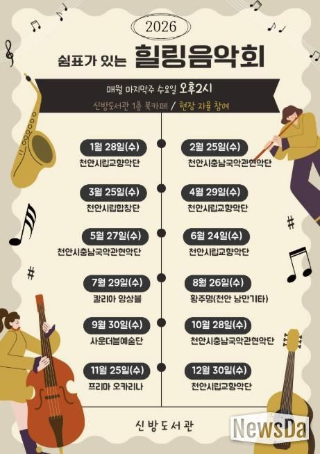 뉴스다 최광묵 기자 | 천안시 신방도서관은 올해 문화가 있는 날에 ‘쉼표가 있는 힐링음악회’를 운영한다고 21일 밝혔다.