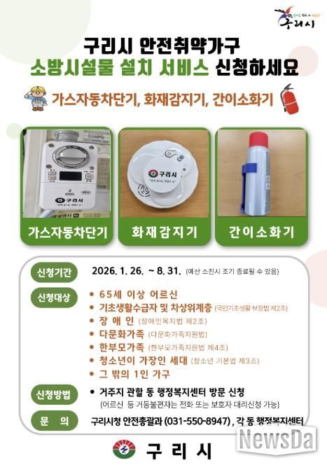 이번 사업은 가스·화재 사고 발생 위험이 큰 안전 취약 가구의 주거환경을 개선하고, 일상 속 안전사고를 예방하기 위해 추진된다. 구리시는 대상 가구에 가스 자동차단기, 화재감지기, 간이 소화기 등 필수 소방시설을 무상으로 설치·지원해, 위급 상황 발생 시 신속한 대응을 가능하게 할 계획이다.
