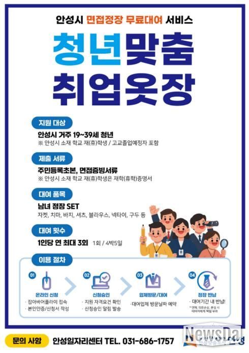 면접에 필요한 정장·구두·넥타이 등을 4박 5일간 무료 대여하며, 1인당 연 3회까지 지원된다. 대상은 안성시 거주 19~39세 청년 구직자와 안성시 소재 대학교 재·휴학생, 고등학교 졸업 예정자다.