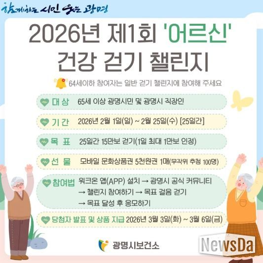 뉴스다 최광묵 기자 | 광명시가 오는 2월부터 모바일 걷기 플랫폼 ‘워크온(WalkOn)’을 활용한 걷기 챌린지 방식을 개편하고, 65세 이상 시민을 위한 ‘어르신 걷기 챌린지’를 별도로 운영한다고 21일 밝혔다.