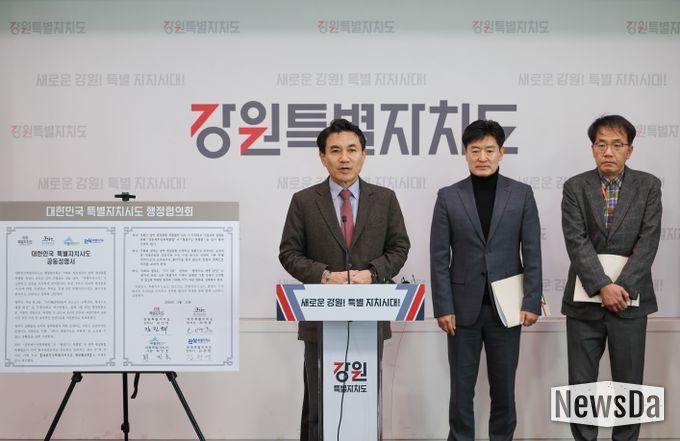 뉴스다 최광묵 기자 | 강원, 제주, 세종, 전북으로 구성된 ‘대한민국특별자치시도 행정협의회’(대표회장 : 김진태 강원특별자치도지사)는 1월 21일 4개 특별자치시‧도의 특별법안 조속한 통과와 광역 행정통합 인센티브 부여에 따른 역차별 우려를 담은 공동성명서를 발표했다.