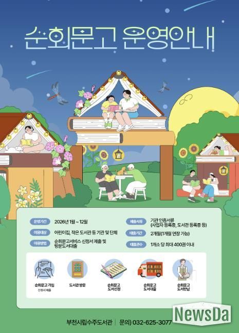뉴스다 최광묵 기자 | 부천시립도서관은 관내 어린이집과 복지시설 등 독서 환경이 열악한 기관과 단체를 대상으로 ‘순회문고 서비스’를 2026년 연중 운영한다. 시민이 일상에서 책을 더 쉽게 접할 수 있도록 돕기 위한 취지다.