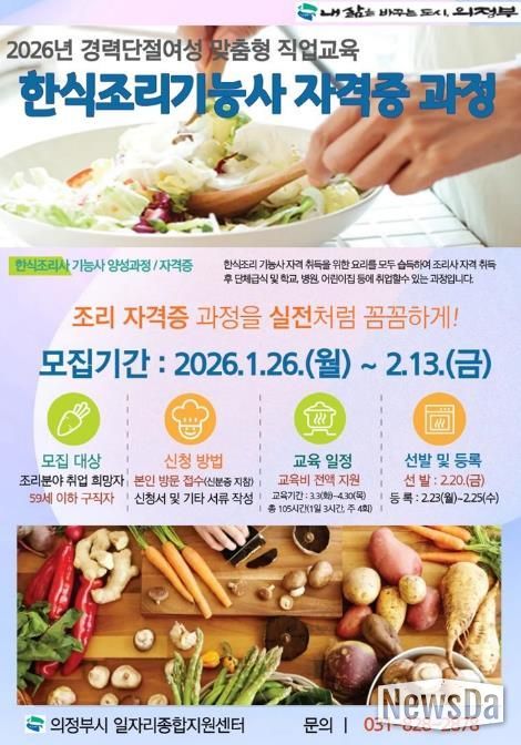 뉴스다 최광묵 기자 | 의정부시는 경력단절여성의 안정적인 재취업을 지원하기 위해 ‘2026년 한식조리기능사 자격증 과정’ 참여자를 모집한다.