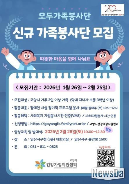 뉴스다 최광묵 기자 | 고양특례시 건강가정지원센터에서는 오는 2월 25일까지 2026년 ‘가족봉사단’참여자를 모집한다.