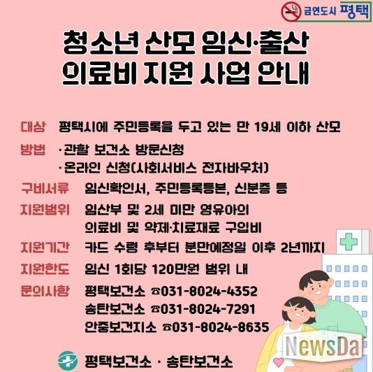 뉴스다 최광묵 기자 | 평택시는 임신과 출산을 준비하는 청소년 산모의 건강한 출산과 경제적 부담 완화를 위해 ‘청소년 산모 의료비 지원 사업’을 적극 추진하고 있다고 밝혔다.