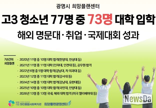 올해 대학에 입학한 자녀를 둔 김 모 씨는 “희망플랜광명센터의 학습과 진로 지원이 아이의 대학 진학에 큰 힘이 됐다”며 “광명시의 지속적인 관심이 아이의 성장을 이끌었다”고 말했다.