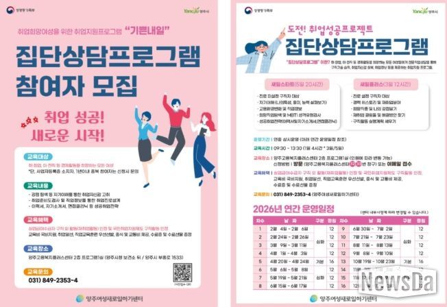 뉴스다 최광묵 기자 | 양주시 양주여성새로일하기센터가 취업을 희망하는 여성들을 대상으로 ‘2026년 집단상담프로그램’참여자를 모집한다.