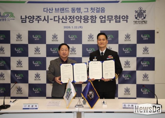 뉴스다 최광묵 기자 | 남양주시는 22일 해군 다산정약용함과 업무협약을 체결하고, 다산정약용 정신을 기반으로 브랜드 가치 확산과 문화·안보 분야 협력에 나섰다.