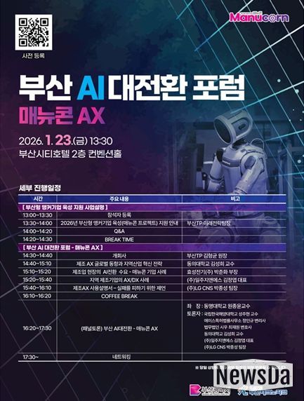 뉴스다 최광묵 기자 | 부산시는 23일 오후 1시 30분 연제구 부산시티호텔 2층 컨벤션홀에서 (재)부산테크노파크 주관으로 '2026 부산형 앵커기업 육성 지원사업 설명회 및 부산 AI대전환 포럼 – 매뉴콘 AX'를 개최한다고 밝혔다.