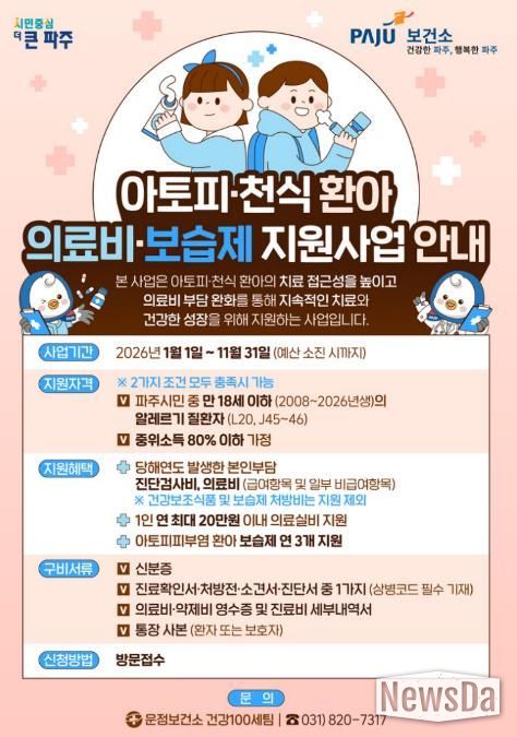 뉴스다 최광묵 기자 | 파주시 운정보건소는 아토피피부염과 천식 등 알레르기질환을 앓고 있는 환아의 건강한 성장과 보호자의 의료비 부담 완화를 위해 ‘아토피·천식 환아 지원사업’을 연중 운영하고 있다.