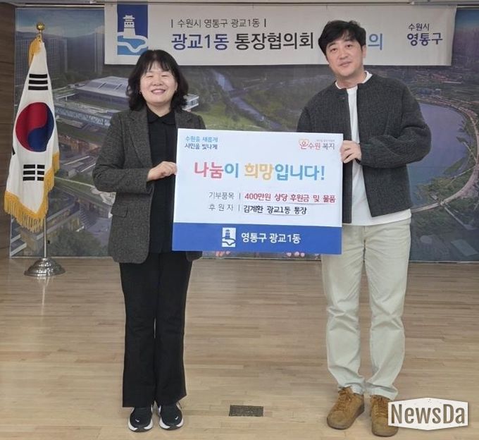 뉴스다 최광묵 기자 | 수원시 영통구 광교1동은 지난 22일, 김계환 광교1동 통장이 이웃돕기 성금 280만 원과 120만 원 상당의 후원 물품을 기탁해 총 400만 원 규모의 나눔을 실천했다고 밝혔다.