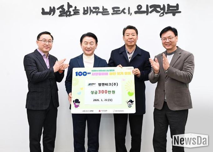 뉴스다 최광묵 기자 | 의정부시는 1월 22일 엠엔테크(주)가 관내 저소득층을 위해 성금 300만 원을 기부했다고 밝혔다.