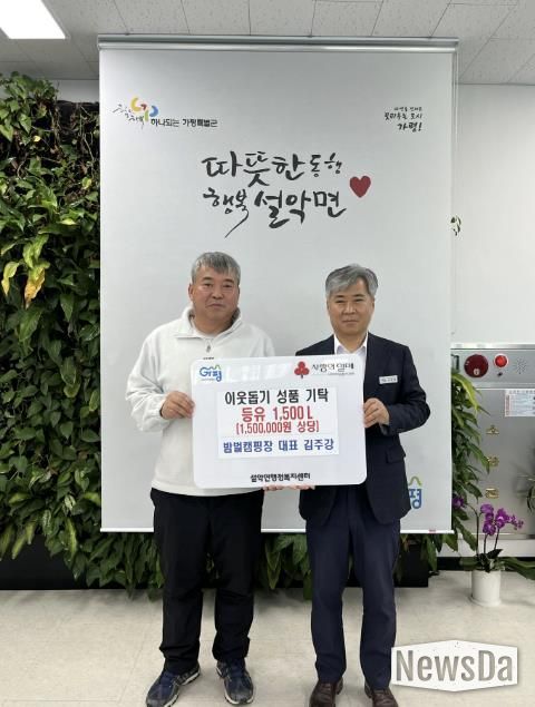 뉴스다 최광묵 기자 | 가평군 설악면 밤벌캠핑장은 지난 21일 설악면 행정복지센터를 방문해 지역 내 어려운 이웃들을 위한 난방용 등유 1,500ℓ(150만원 상당)를 기탁했다.