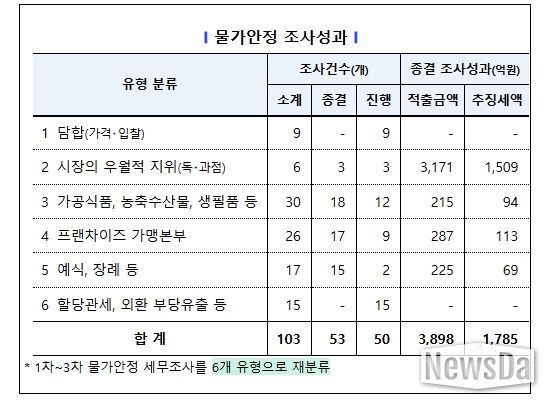 이에 국세청은 ’25.9월부터 ’26.1월까지 3차에 걸쳐, 과도한 가격 인상으로 폭리를 취하며 탈세를 일삼은 담합, 독・과점, 가공식품・생필품 제조, 농축수산물 유통 등 103개 업체에 대해 조사를 실시했으며, ’25.9.25. 착수한 1차 세무조사 결과, 53개를 종결하여 3,898억 원을 적출하고, 1,785억 원을 추징했다.