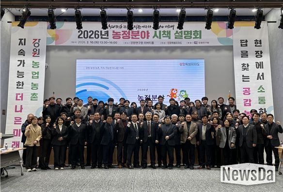뉴스다 최광묵 기자 | 강원특별자치도는 2월 10일 강원연구원에서 18개 시군 농정부서장 등 80여 명이 참석한 가운데 ‘2026년 농정분야 시책 설명회’를 개최했다.