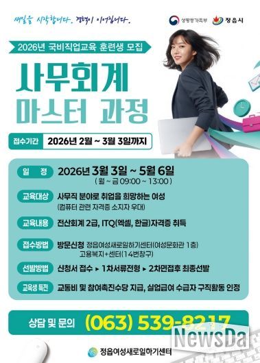 뉴스다 최광묵 기자 | 정읍여성새로일하기센터는 2026년 국도비 직업교육훈련의 일환으로 ‘사무회계 마스터 과정’을 운영하기로 하고, 교육에 참여할 훈련생을 오는 3월 3일까지 모집한다.