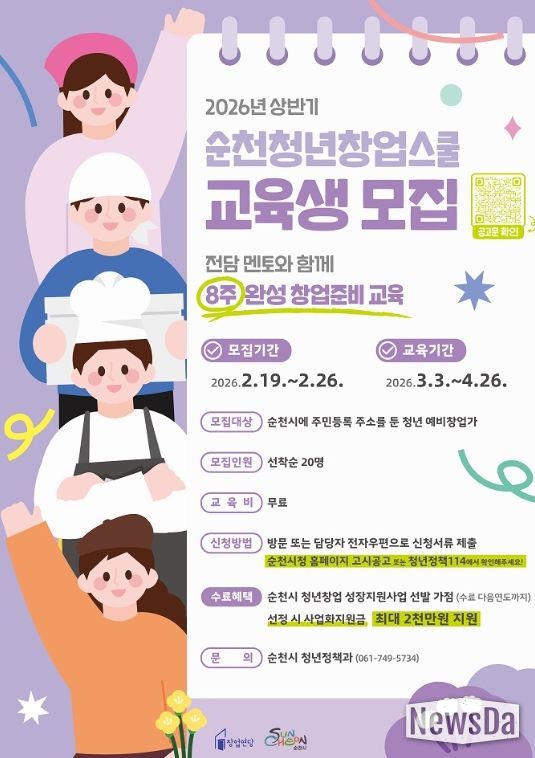 뉴스다 최광묵 기자 | 순천시는 창업을 준비하는 지역 청년들의 아이디어를 구체화하고 체계적인 사업화를 지원하기 위해 '2026년 상반기 순천청년창업스쿨' 교육생을 오는 19일부터 26일까지 모집한다고 밝혔다.