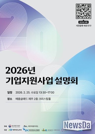 뉴스다 최광묵 기자 | ◌ 제주테크노파크(원장 지영흔, 제주TP)는 오는 25일 오후 1시 30분부터 메종글래드 제주호텔 2층 크리스탈홀과 루비홀에서 주요 기업 지원사업을 소개하는 ‘2026년 기업지원사업설명회’를 개최한다고 19일 밝혔다.